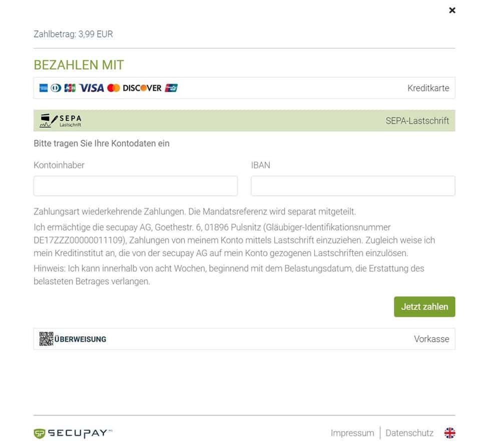 Sie können SEPA-Lastschriften über secupay mit und ohne Scoring, mit und ohne Zahlungsgarantie, mit bis zu 28 Tagen Vorautorisierung, als wiederkehrende händlerinitiierte Zahlung oder als Abonnement einreichen. Hat der Kunde einmal seine IBAN hinterlegt, so kann er seine Einkäufe mit einem Klick abschließen und bezahlen, ohne lästige 2-Faktor Authentifizierung wie bei Zahlungen mit Kreditkarte oder Paypal. SEPA-Lastschriften ‘Processed by secupay’ ​bedeutet Felxibilität pur.