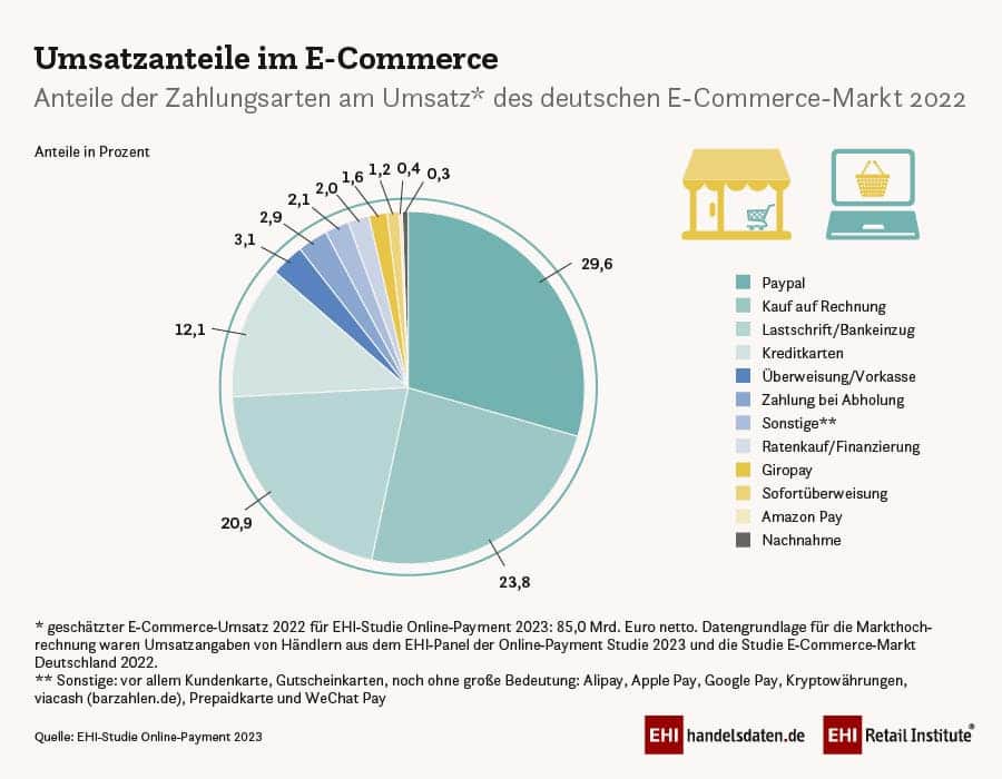 Die meisten Online-Shopper zahlen per Rechnung, Paypal, Lastschrift oder Kreditkarte. Laut EHI Paymentstudie entfallen 85 Prozent des E-Commerce-Umsatzes auf eine dieser vier Bezahlarten. Eine Umfrage des Digitalverbands Bitkom ergab, dass knapp jeder zweite Kunde am liebsten mit einem Online-Bezahldienst wie Paypal, Klarna oder Amazon Pay bezahlt, wenn Shops diese Option anbieten.
